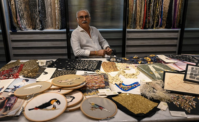 Sitting in a lotus position, four men weave glittering beads through gold thread on an organza sheet, carefully constructing a wedding dress that will soon wow crowds at Paris Fashion Week.