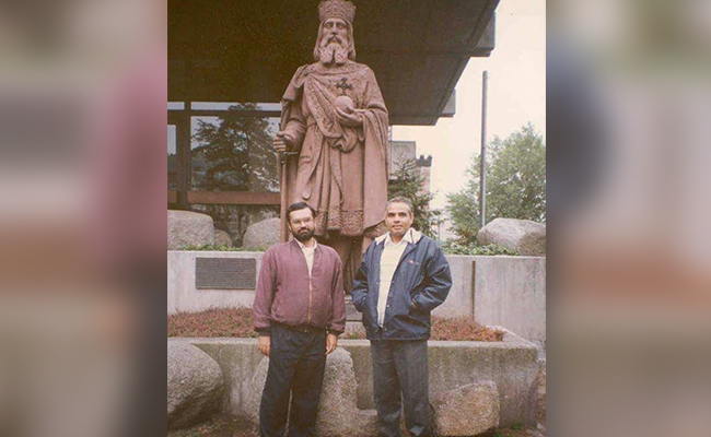 It shows a young PM Modi and one of his colleagues standing before the statue of Charlemagne, the medieval emperor in Western Europe who founded the Holy Roman Empire.