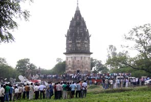 Indian onlookers watch as a team from the state archaeological survey of India dig at the Raja Rao Ram Bux Singh temple