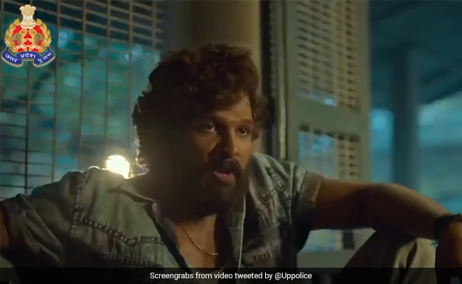 The clip shared by UP Police begins with a clip of Allu Arjun as Pushpa Raj, mouthing the lines, "Pushpa. Pushpa Raj. Main jhukega nahi."