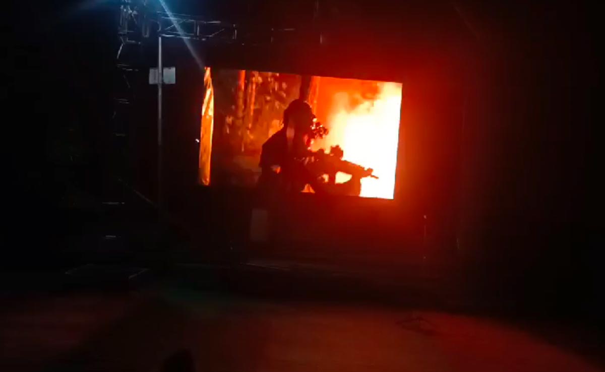 Before the screening of the movie, the national anthem was played at the open air theatre, located 63 km from the capital city.