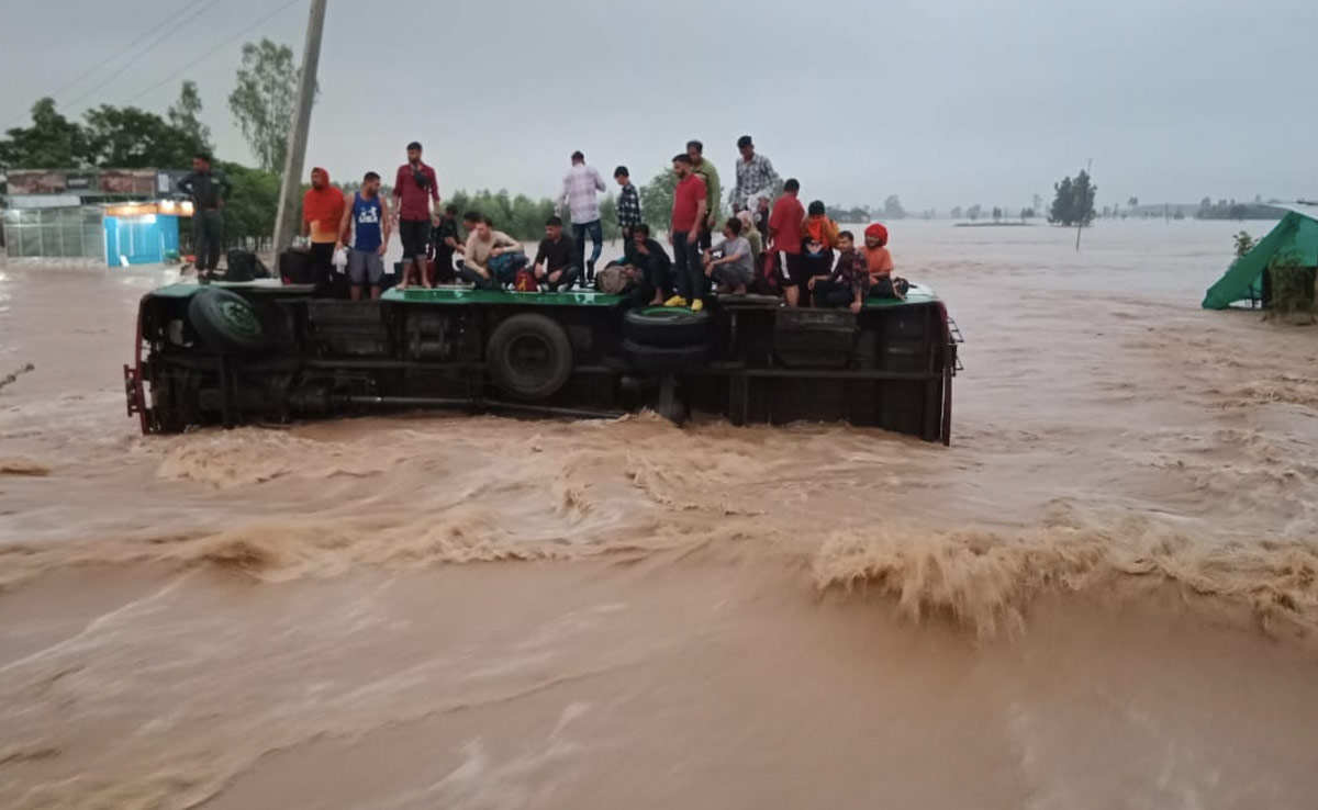 Several people were seen standing atop an overturned bus waiting to be rescued in Haryana in one of the many scenes of despair across north India which has been hit by monsoon fury.