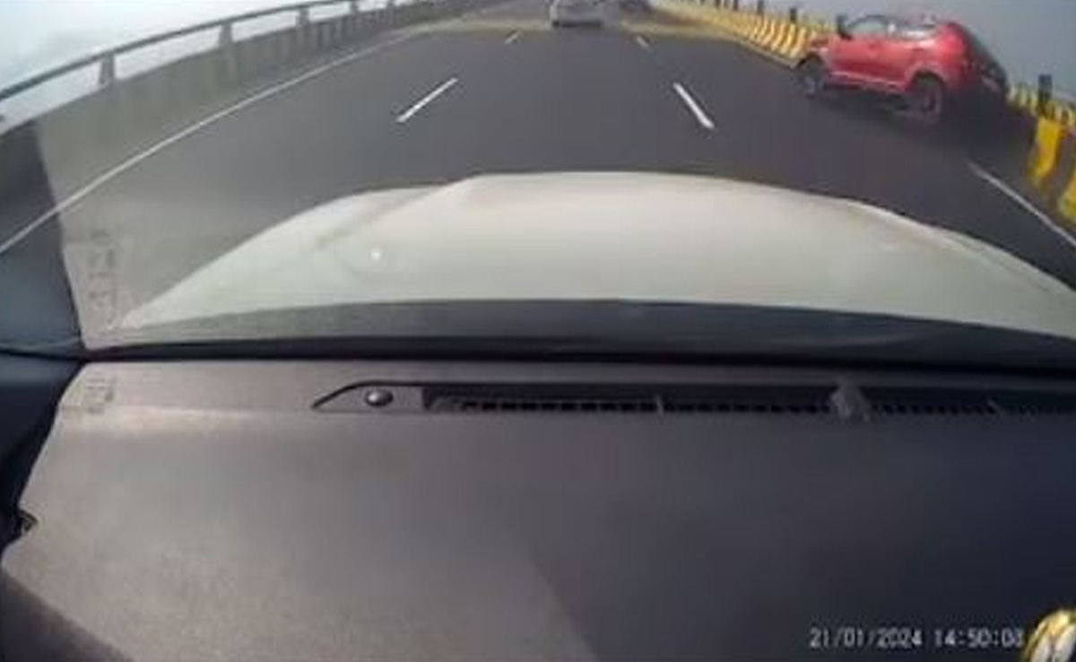 The video, captured by the dashcam on the car behind it, shows the hatchback cutting across lanes and slamming into the railing on Sunday afternoon. The car, travelling to Chirle (a village in Uran taluka of Raigad district), had two women, children in it at the time of the accident. All passengers are reported safe.