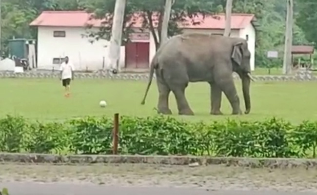 A wild elephant surprised a group of people playing football at a military camp in Assam's Guwahati when the large animal gently walked into the field and briefly participated in the play.