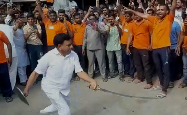 Madhya Pradesh Finance Minister Jagdish Dewda seen performing with the sword
