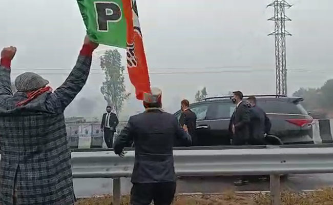 In the clip, a group carrying a BJP flag is seen shouting slogans of "BJP Zindabad" while standing dangerously close to the Prime Minister's car - a black Toyota Fortuner -on the other side of the highway.