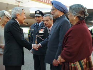 The Emperor and Empress arrived in New Delhi today and were received by Prime Minister Manmohan Singh and his wife Gursharan Kaur at the Air Force Station at Palam, in a departure from the usual protocol.