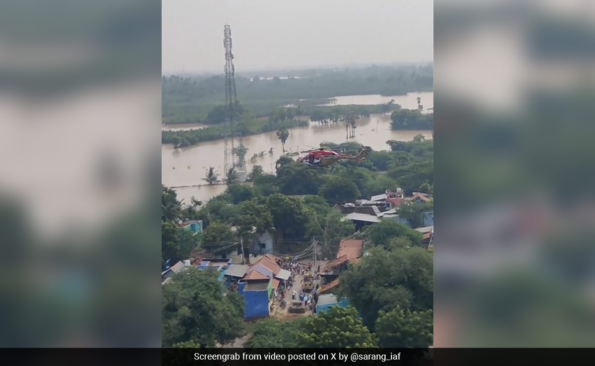 A video posted by the Sarang Helicopter Display Team on X showed food and essentials being air-dropped onto the terraces of homes submerged in floodwaters. The stranded locals in south Tamil Nadu stood on rooftops for their supplies.