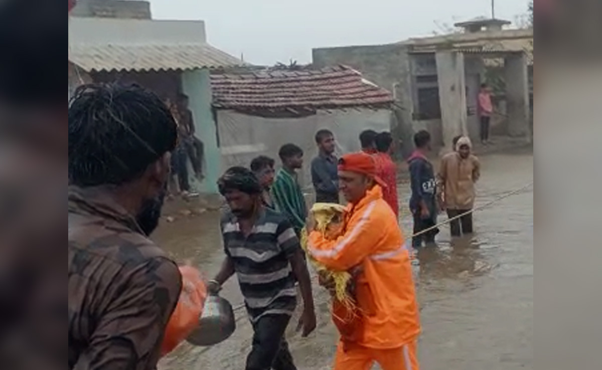 In a video, an NDRF personnel can be seen carrying an infant out of the school wrapped in an empty cement bag to protect it from the pouring rain. The rescuer carries the infant through knee-deep water and hands it over to a family member waiting in an area where the water level is lower.