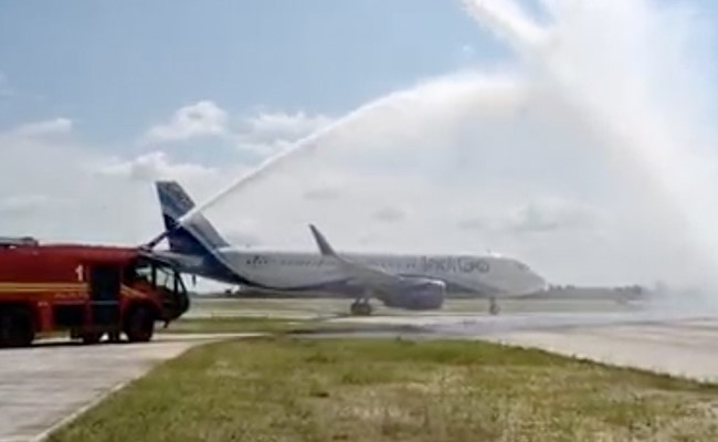 Two water cannons greeted the Airbus A320 aircraft after it landed at India's newest airport.