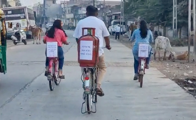 With the intention to underline the issues of high fuel prices, inflation and joblessness, the Congress MLA from Amreli went to the polling booth on a bicycle with a cylinder on it.