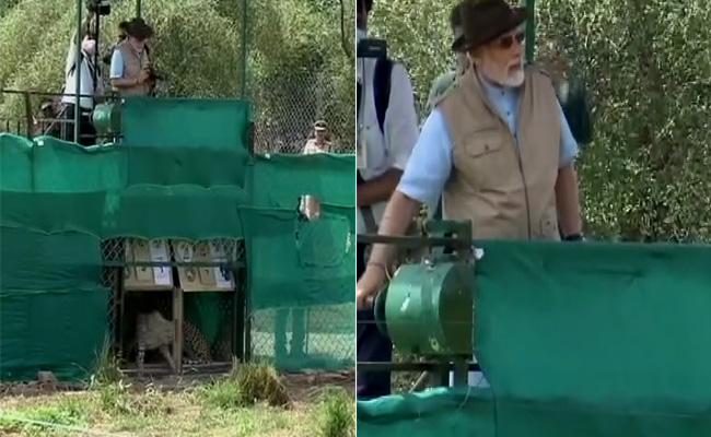 Wearing a pair of sunglasses, a safari hat and vest, Prime Minister Narendra Modi was seen cranking a lever to release a pack of cheetahs from Namibia into a special enclosure in Madhya Pradesh's Kuno National Park on Saturday as part of a government's project to reintroduce the feline in India.