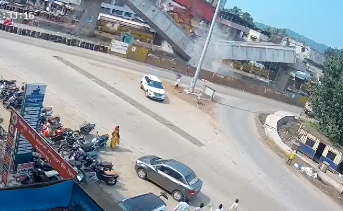 An under construction flyover in Maharashtra broke into two and collapsed Monday afternoon, damaging a crane machine and sending up a huge dust cloud, showed a video.