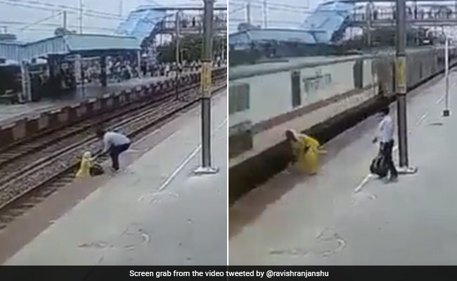 The footage shows the woman, wearing yellow-coloured salwar kameez, trying to get on a platform from the railway tracks while the train is about to enter the station.