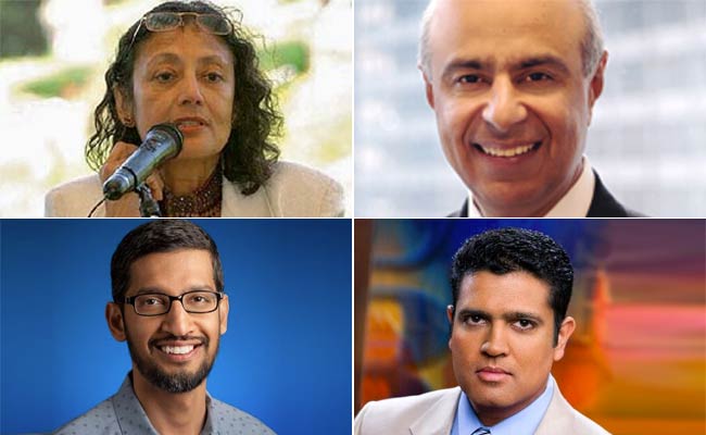 Bharati Mukherjee (Photo: britannica.com), Vikram Malhotra (Photo: mckinsey.com), Hari Sreenivasan (Photo: Twitter) and Sundar Pichai (Photo: Twitter)