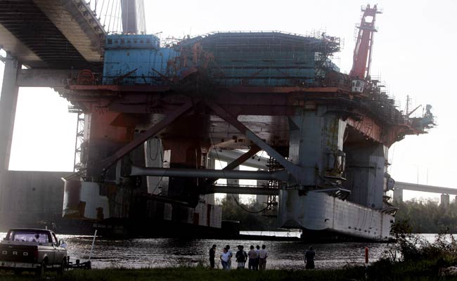 People gather to watch an oil rig that broke apart in drydock during Hurricane Katrina in Mobile, Alabama. (Associated Press photo)
