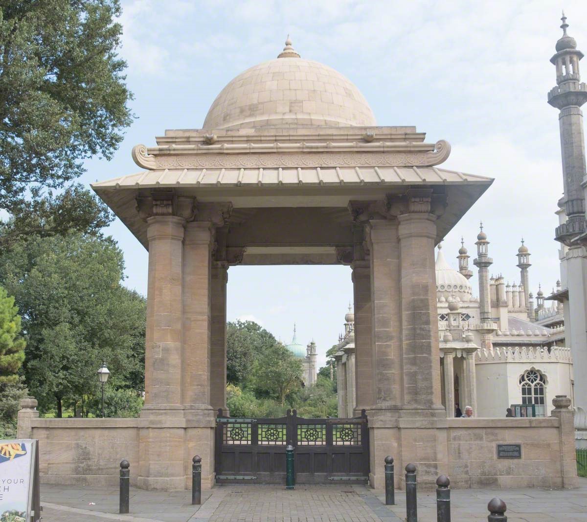 The India Gate, designed by Thomas Tyrwhitt, replaced a much lower gate that was erected by Brighton Corporation following its purchase of the Pavilion in 1850 and is described as a dome resting on four pillars in a style derived from Gujarat.