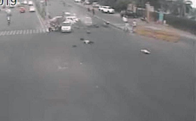 CCTV footage of the incident shows two people who were on a motorcycle, thrown several metres high into the air, and falling about 60 feet from where their bike was standing.