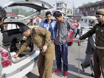 Jammu and Kashmir police check vehicles outside MA stadium which is the venue of Narendra Modi's rally.