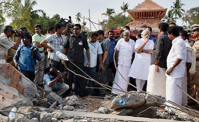 Prime Minister Narendra Modi visits the site of fire tragedy near Kollam in Kerala. (Press Trust of India photo)