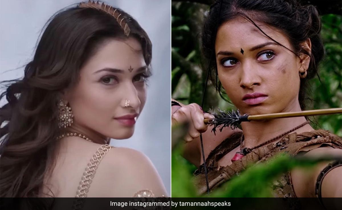 Tamannaah was the perfect pick for a warrior princess as she transitioned from a South Indian glam look to a princess in the wild dressed in camouflage brown toned clothes along with her primal bow and arrow for a combat scene. But what remains iconic is Tamannaah in an angelic white and gold attire running towards a picturesque waterfall.