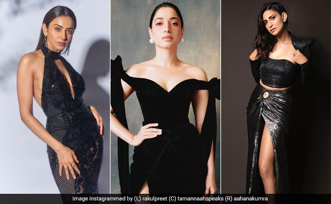 Black dresses and gowns have a special place in our wardrobes. The all-time favourite colour manages to bring out the best in everyone and is a classic style that is cherished by almost all. This includes Bollywood divas who need no reason to slay this colour and they effortlessly do so with their chic outfit choices. Recently, Aahana Kumra, Tamannaah Bhatia and Rakul Preet Singh made striking statements as they wore envy-worthy black outfits. Aahana wore a stunning co-ord set from clothing brand Jewellyn Alvares and grabbed all the eyeballs. The black three-piece co-ord set consisted of a tube crop top, wrap skirt with a dramatic thigh-high side slit, and the actor carried a full-sleeved short jacket to go with it. For accessories, the actor wore statement rings and stud earrings with black strap heels. Aahana's glamorous makeup with shimmering eyelids, nude lipstick, kohl-laden eyes was perfect for the night.
