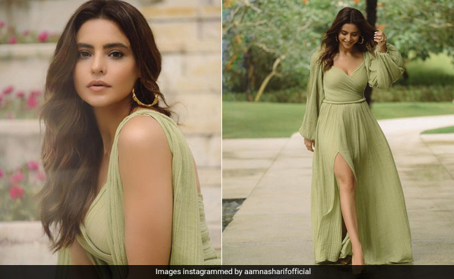 From vibrant bikinis to printed beach wear, and graceful sarees to elaborate lehengas, Aamna Sharif's sartorial choices are bold and beautiful. With every wardrobe experiment, she manages to amaze her fans and today was no exception. The diva opted for a breezy chiffon dress in mint green colour and it was a fresh start to the weekend ahead. The floor-length outfit featured lantern sleeves with a plunging neckline, a gorgeous fall and a dramatic thigh-high side slit. The tie-knot details at the back and the mint green waist accentuated her monochrome outfit. Leaving her tresses loose in natural curls, Aamna's white manicure, gold hoops and metallic pointed heels looked fabulous with her outfit.