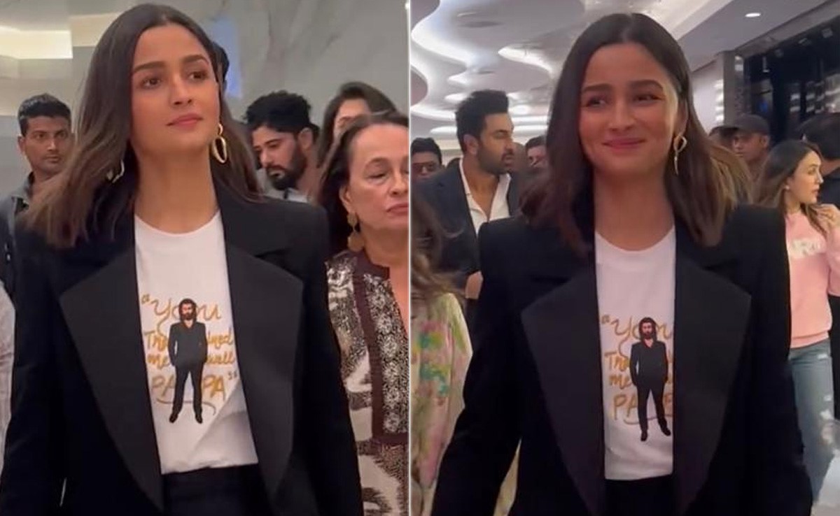The Ranbir Kapoor starrer Animal is releasing in theatres on December 1, 2023, and Ranbir's support system cannot keep calm for the release. The movie has already created a stir with its phenomenal teaser and trailer, and for the screening of Animal held in the city last night, Alia Bhatt was the biggest supporter in an Animal-themed white t-shirt that she wore beneath a full-sleeved blazer and teamed with a pair of black wide-leg pants. The customised t-shirt of Alia had Ranbir's look from Animal printed over it. Alia's outfit was the perfect blend of casual chic and yet did well to convey her well-earned boss babe vibe. She is one of the reigning stars and fashionistas of Bollywood after all. For accessories, the actress picked a pair of golden chunky earrings and carried a black sling bag. Leaving her tresses loose in waves, Alia's minimal makeup included a nude lip colour, a dash of kohl, and a rosy cheek tint.