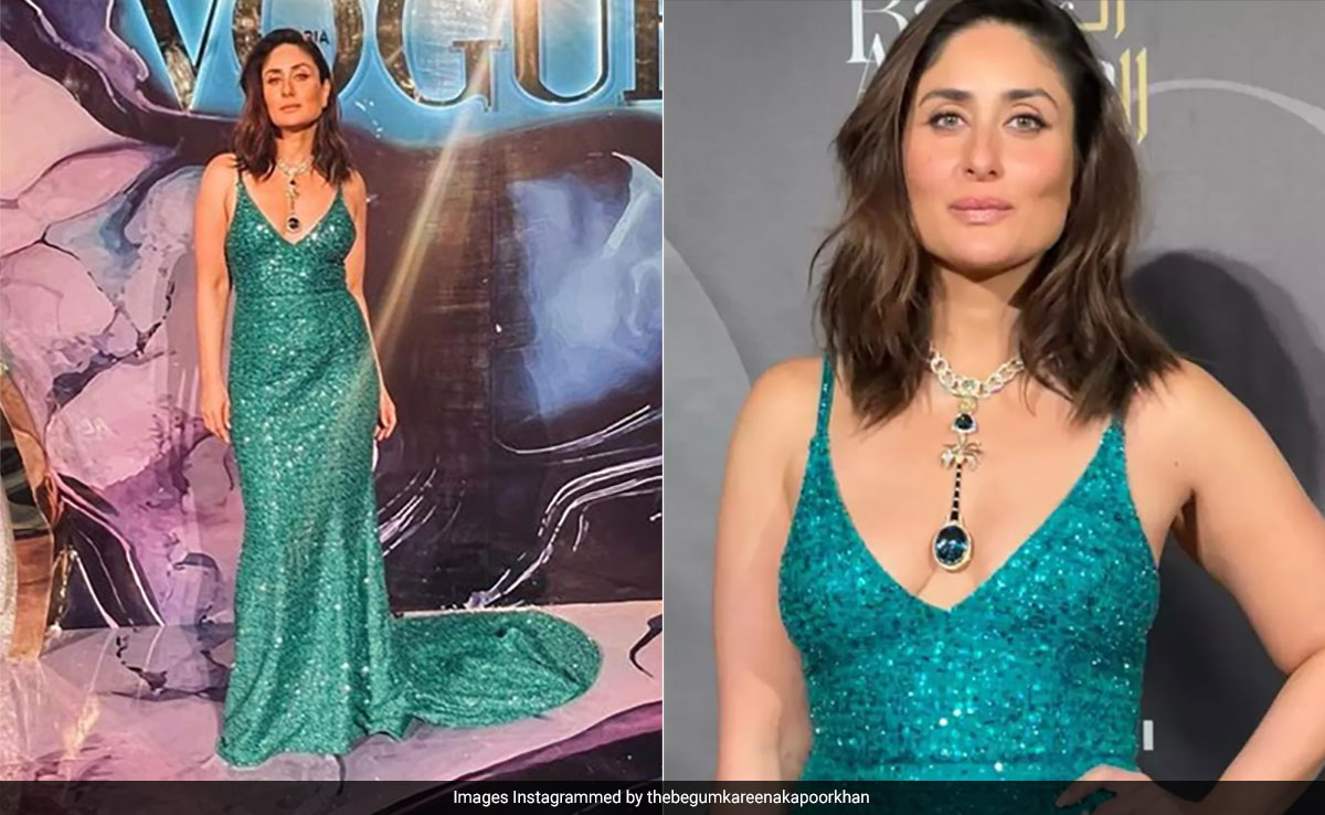 Kareena Kapoor sets the internet ablaze whenever she makes a public appearance. Her sartorial choices for movie promotions, award ceremonies, and red-carpet events are always top-notch, making us swoon over them. We have yet another proof of it. The diva attended the Vogue Ball of Arabia event recently and opted for a sparkly Sabyasachi head-to-toe outfit for the event. The strappy, floor-sweeping outfit featured a body-hugging silhouette that accentuated Kareena's well-toned body. It came with a deep neckline and shimmery blue sequins all over and extended into a glamorous train that followed. The actress carried a matching sequinned clutch with the outfit. She wore a studded necklace with an exquisite pendant in green and kept it sleek and chic. Her tresses were left loose in natural waves, and she opted for minimal dewy makeup with mascara-laden eyes and a dewy glow.