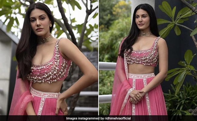 The gorgeous Amyra Dastur is turning up the heat once again. The fashionista has left us in awe with her new dazzling ensemble. What did she wear this time? Amyra took up a pink festive lehenga to bedazzle us. She wore a vintage rose chiffon embroidered lehenga set from the festive collection of Ridhi Mehra. The sleek sleeveless blouse was stitched with beads. The lehenga from Ridhi Mehra had a broad silver embroidered border at the rim and cost Rs 1,38,000. Amyra looked effortlessly beautiful with a chiffon dupatta thrown over one shoulder. She added a more festive touch by wearing a golden neck choker and golden earrings.