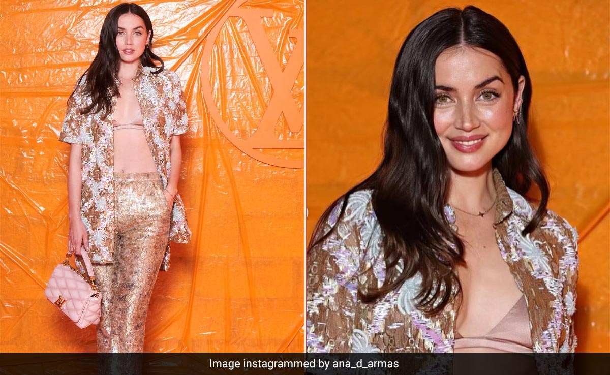 Paris Fashion Week has concluded in its full glory and it was a total success attended by prominent names, celebrities, and global icons. It was indeed a vision to behold for all fashion enthusiasts. Not just on the ramp but also beyond it. Ana De Armas attended the Louis Vuitton show as a house ambassador for the label at Paris Fashion Week and made a glittery style statement while doing so. Her outfit consisted of a metallic gold bralette, a shimmery sequined button-down short-sleeved shirt with sheer details and delicate embellishments, and a pair of shimmery gold sequined flared pants to complete the resort wear vibe. For accessories, she wore a delicate necklace and gold earrings. Her dewy makeup consisted of rosy cheeks, kohl-laden eyes, and a brownish lip gloss.