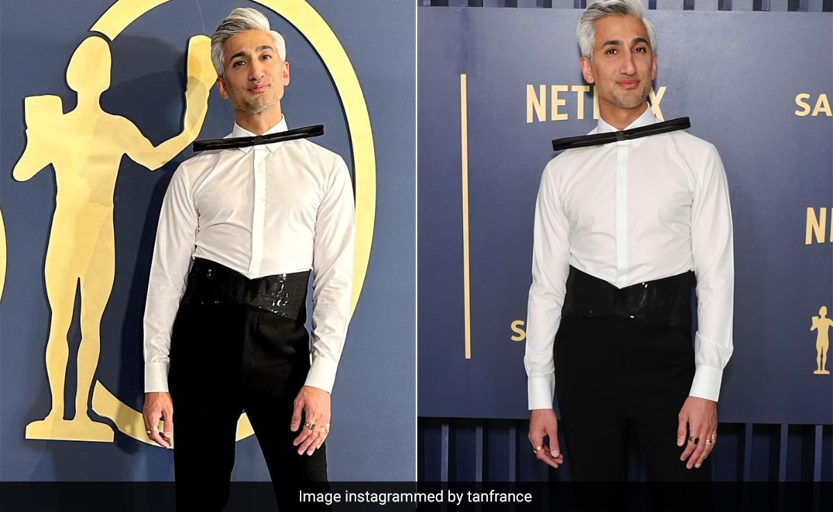 Queer Eye fame Tan France's fashion wardrobe is a wonderful fusion of sophistication and casual splendour. In his latest appearance at the 30th Screen Actors Guild (SAG) Awards in Los Angeles, the designer took the quintessential suit game to a whole new level. For his first look, Tan picked out a well-fitted crisp white collared shirt and paired it with jet-black trousers. Chosen from the shelves of Indian designer Amit Aggarwal, the television personality “felt so damn chic” in the outfit. We can't help but agree. A shimmery leather waistband with slightly raised edges gave a flashy twist to the formal ensemble. The X-factor was brought on by the dramatically elongated black sculptural bow tie, secured around his neck. While statement rings delivered a classy touch, sleep black shoes rounded off Tan's suave avatar.