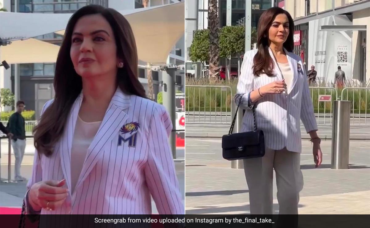 Nita Ambani's sartorial choices; from elaborate festive wear to red carpet fashion, has won hearts over the years. She adds elegance to every attire she chooses. It's the same with her formal looks as well. Nita Ambani exuded boss-lady energy in a pinstriped ivory pantsuit when she attended the IPL Auction in Dubai with her son Akash Ambani. The full-sleeved blazer featured her team Mumbai Indian's logo, which she wore with flared trousers. She also wore a plain white T-shirt beneath the blazer. She picked a pair of strap heels to complete the look and carried a black sling bag with it. Leaving her tresses loose in natural waves, she wore minimal glam makeup and perfected the business look.