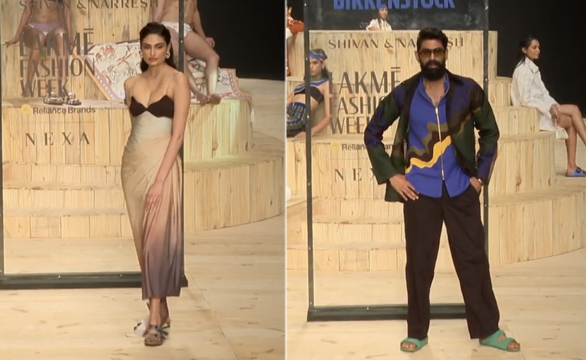 With a maximalist approach to creativity, Indian designers are bringing their best work to the runway as fashion unfolds. After a day of multiple collections being showcased, the latest one to add to it was of Shivan and Narresh. The designer duo brought a beautiful presentation of silhouettes to the ramp. While the reimagined designs stole the show, Athiya Shetty and Rana Daggubati were the highlight too as they walked for the designers. Athiya looked stunning in a silver and brown ombre number that came with a plunging neckline and a strappy pattern. Her minimal glam and put-together tresses completed the look. In collaboration with Birkenstock, the designer duo presented a collection that radiated easy chic style. While Athiya's style was ombre, Rana Daggubati's look was all about bright hues and prints as he paired a printed zipper shirt with a jacket and loose-fit pants. The cool, quirky green slip-ons completed his look.