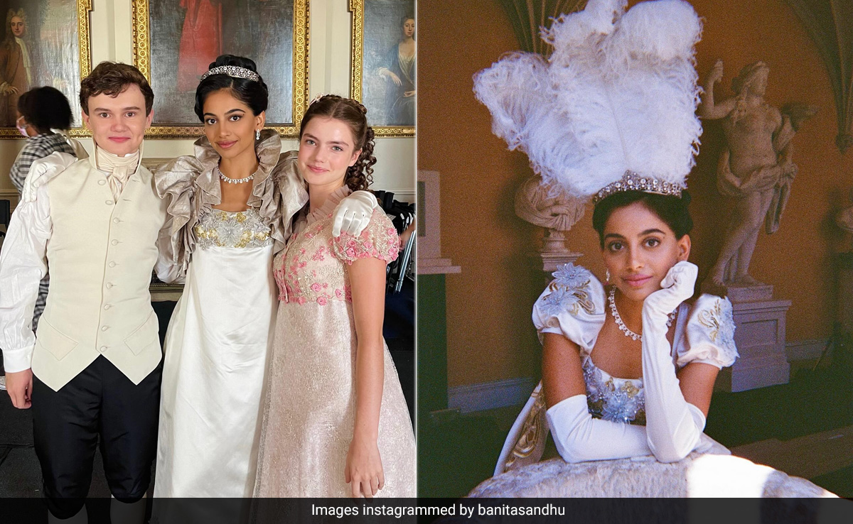 Bridgerton Season 3 part 1 is finally here and the internet is buzzing. But the latest season of the Netflix series came with a bigger surprise than we anticipated, revealing that Bollywood actress Banita Sandhu is the newest addition to the Bridgerton family. Now, Banita has shared a thank you note along with a few BTS pictures from the show and her elegance in the Regency era aesthetic is refreshing. In the first image of her carousel post on social media, Banita can be seen posing in a Regency gown in gold and off-white hues. Embellished with sequins and beads around its U-neckline, the outfit featured puffy sleeves adorned with 3D floral motifs. Banita styled the look with white evening gloves. From the accessory aisle, the actress picked a slinky gleaming necklace with matching drop earrings. A studded headpiece with massive white feathers added all the drama. For glam, Banita simply went with pink-tinted lips and neutral eyelids.