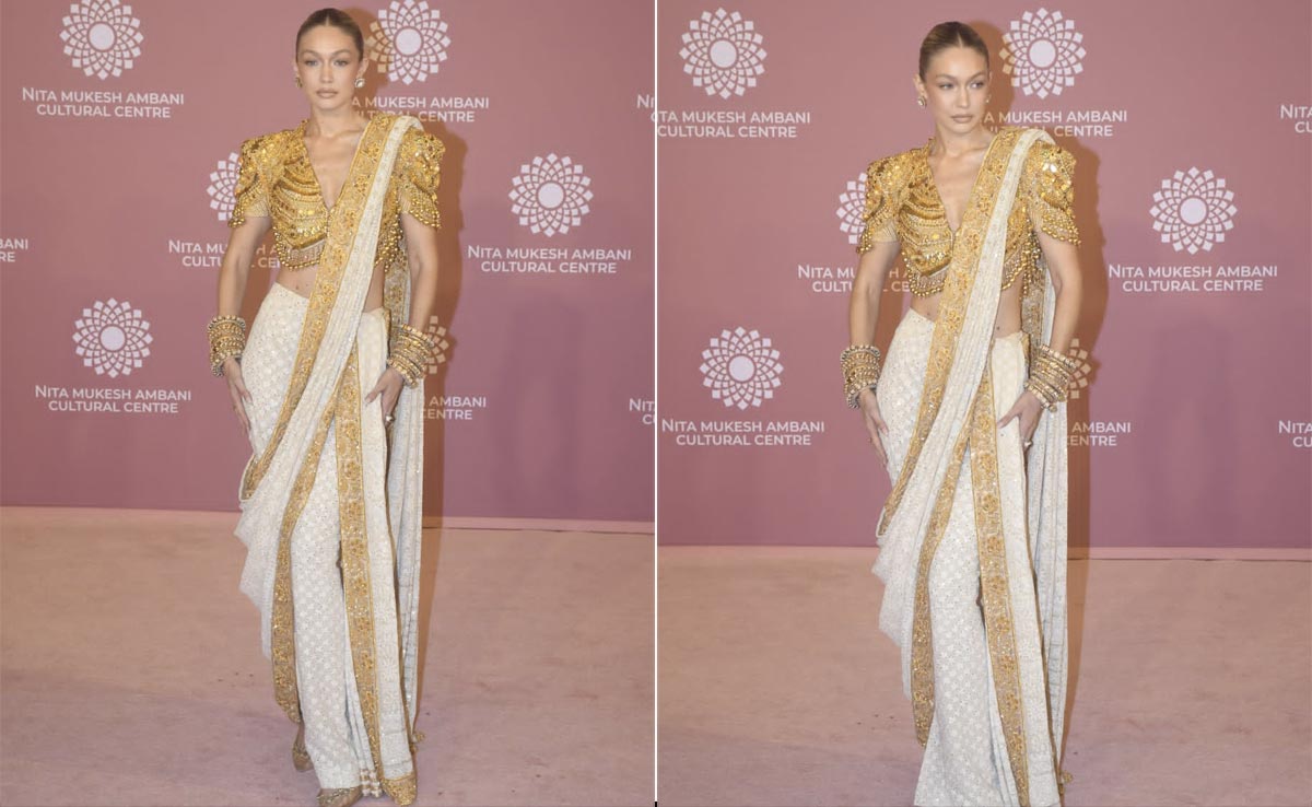 The world knows the iconic pink carpet of the Met Gala in New York but after the weekend that was, we can easily put another pink carpet on the fashion world map. The launch of the Nita Mukesh Ambani Cultural Centre was a spectacle for the arts and the fashion world but no less than grand with the appearances of some of fashion's most influential people. Gigi Hadid walked straight out of the runway and onto the pink carpet of the grand launch to prove she is easily one of them. A magnificent sight to see a beauty like her in a saree and not just your regular saree, ladies and gentlemen, the gold standard of couture. The Lucknawi saree was made in the due course of a year by women who specialise in different stitching techniques. The supermodel was draped in a splendid chikankari weave by designers Abu Jani Sandeep Khosla. The beautiful ivory saree, complete with intricately designed golden borders looked beyond stunning on Gigi, but the best was yet to come. The archival gold blouse was a piece of art on display but easily turned into a masterpiece the minute Gigi paired it with her glorious white saree. The structured golden blouse with tassels on all sides is a case of high fashion done beautifully. In case you missed the golden touch, Gigi had more in store. The stacked bangle style came into place for Gigi Hadid in thick traditional bangles on both her hands. Her fresh makeup and her structured sleek bun struck the perfect balance to the grandiose of her outfit. We'd mistake Gigi Hadid to be a reimagined modern-day Paro from Devdas and we know that you see the striking similarities too.