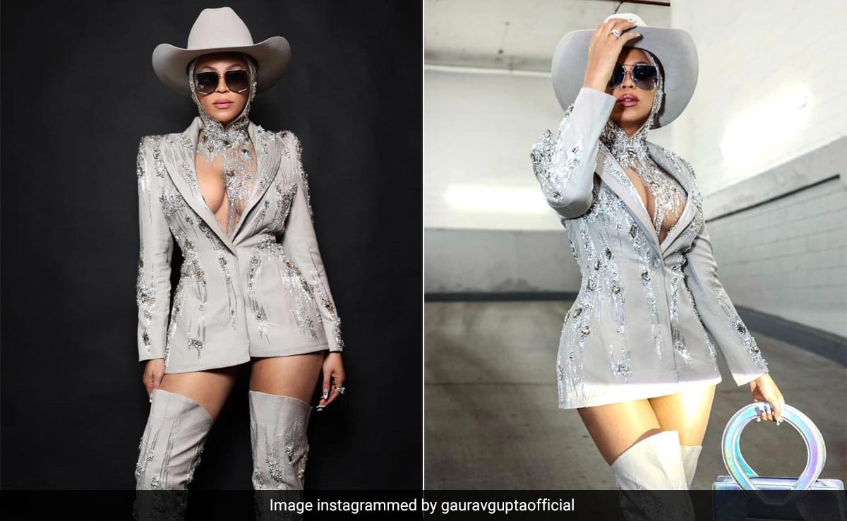 Beyonce could wear a sack and still make it look like haute couture. That's probably why she is considered such a force of fashion that sitting on the front row of New York Fashion Week deserves couture and no less. To go cowgirl core too, as she has been in the recent past, she relies on the ace Indian couturier Gaurav Gupta at the Luar show held recently. She picked a celestial grey embellished blazer dress layered over a matching hooded sheer bodysuit and thigh-high boots. It seems fair to have seen this outfit first on the runway one day and directly in Beyonce's closet on the next. In keeping with the cowgirl theme of her latest aesthetic to publicise her latest singles, she adds a grey cowboy hat and sunglasses. We'd need the sunglasses too because in Gaurav Gupta's creations especially, she shines the brightest.
