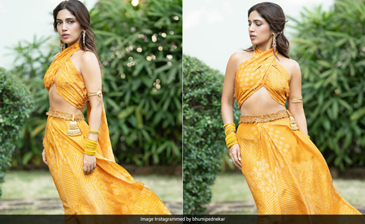 Be it on the red carpet or during the festive season, Bhumi Pednekar's ethnic choices have always been top-notch. The actress's sartorial picks beautifully blend contemporary styles with traditional outfits. Yet again she is spreading ethnic charm with a contemporary touch. The actress slipped into a customised skirt set, coming from the shelves of the clothing label Punit Balana. The bright yellow two-piece set featured a criss-cross style blouse with a halter neckline. The backless number highlighted floral motifs in a soft, white hue. She teamed it with a matching asymmetrical skirt with a flowy hem. The high-waist bottom featured geometrical and floral motifs. The silver sequined lace on the waist turned out to be the only embellishment on the outfit. Bhumi Pednekar styled the look by partly tying her middle parted flowy tresses. A pair of heavy-duty traditional danglers in contrasting fuchsia pink hue completed her look. Apart from the danglers, Bhumi also picked yellow bangles and a gold bracelet from the accessories section. Her nude make-up looks included matte mauve lips, neutral eyeshadow, subtle winged eyeliner, generous blush and bushy brows.