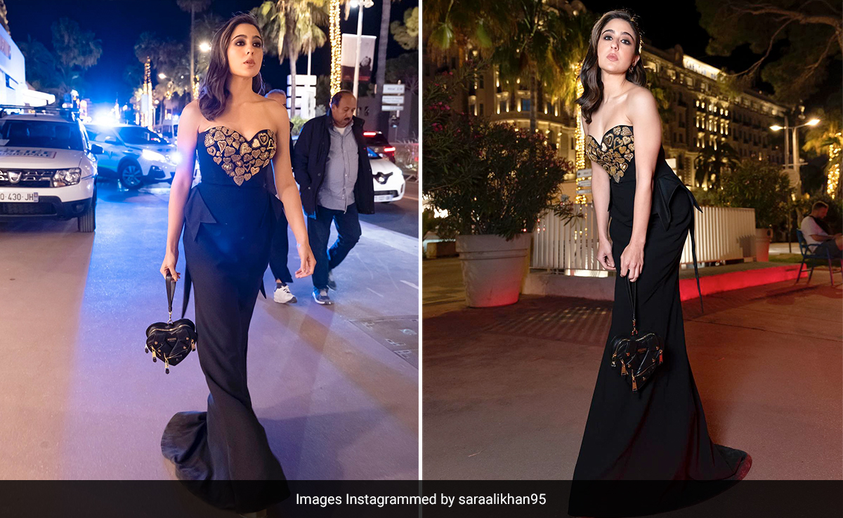 The sartorial extravaganza at the 2023 Cannes Film Festival has started on a glamourous note. Among many debutantes was Sara Ali Khan who first stole the show in an Abu Jani Sandeep Khosla lehenga . A quick change later, Sara wooed us in an ultra-glam diva look as she made a fashion statement in a stunning Moschino heart dress for the official opening night party of the 76th edition of the Cannes Film Festival. Sara's dress was from the heart collection of the brand. What better than a gold and black silhouette to turn up to an after party, right? She looked nothing short of a glamorous diva in the strapless black gown that also had a heart shape detailed along the neckline. The gold accents added a dash of bling to the flattering fit and the cutout heart shapes in shimmer were eye-catching. To complete her style, Sara paired the look with a matching heart-shaped black purse that had gold chain detailing. Sara has been a loyalist of outstanding elegant styles and she made a case for the same yet again with her latest outfit.