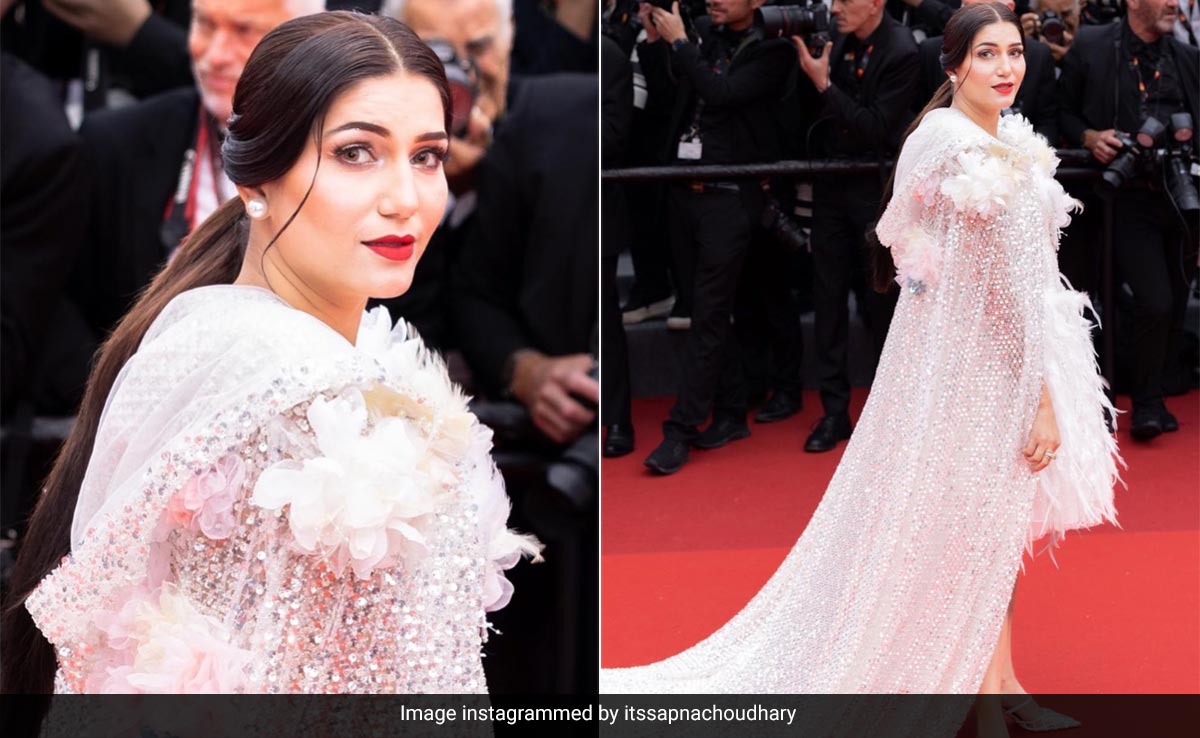 Haryanvi artist Sapna Choudhary didn't disappoint with her Cannes red carpet entry, which was nothing less than a “dream come true” moment for her. Sapna strutted onto the red carpet of the 76th edition of the Cannes Film Festival in Ruby Fang's white short dress. The outfit featured the designer's signature feather detailing on the flowy hem. The bustier came with silver embellishment. Sapna's overall look was accentuated through her sequin veil that extended to form a cape-style train. It was further amped through massive flower detailing on her shoulders. White ombre eyes looked perfect with full lashes. Bold red lips and a middle-parted low ponytail sealed the look for her.