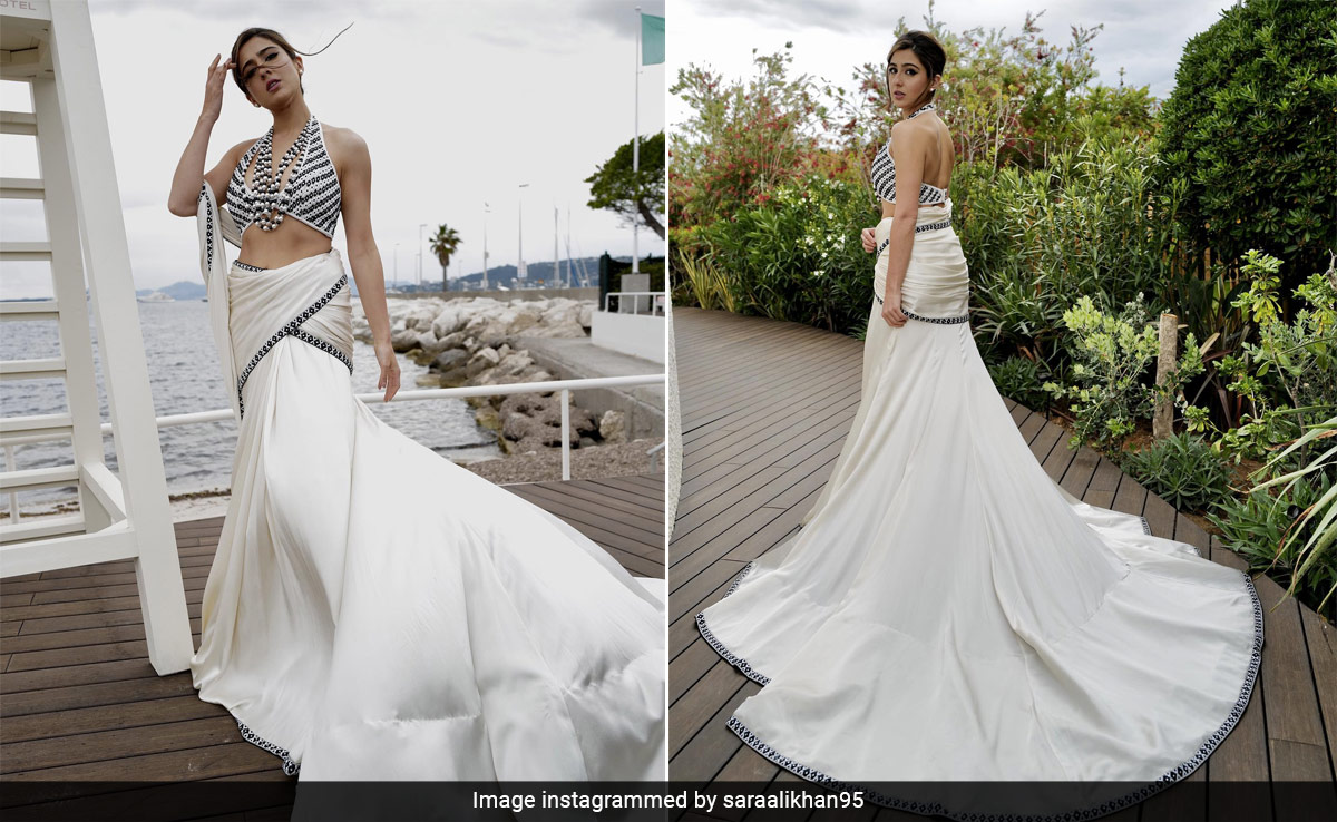 We were eagerly waiting to see Sara Ali Khan making her Cannes debut this year. We expected it to be a top-notch affair. But exceeding our expectations, Sara made a stellar debut and made top-notch red carpet choices. She chose a gorgeous white saree gown from designer label Abu Jani Sandeep Khosla and looked phenomenal on the French Riviera. The breezy drape was featured delicate minimal borders in black and was neatly pleated around Sara's well-toned body. Sara left the pallu on her hand and let the trail follow. She teamed it with a sleeveless black and white blouse and plunging neckline. She accessorised the look with a beaded necklace and stud earrings. Tying her tresses in a sleek updo, the actress opted for minimal glam makeup.