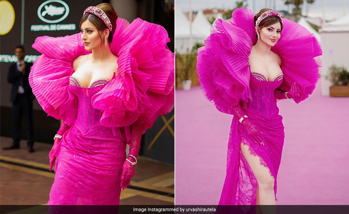 Urvashi Rautela made her first appearance at the Cannes Film Festival 2024 in a pink gown designed by the label Khaled & Marwan. The bright coloured creation featured a pink lace corset with sequin bustier details. It was fringed by an oversized ruffled neckline that was worn off her shoulders. The dress continued with a pleated detail that was draped at the waist and a slit over the side. Miss Rautela completed the look with pink lace gloves, a bejewelled hairband and sparkling silver-toned jewellery.