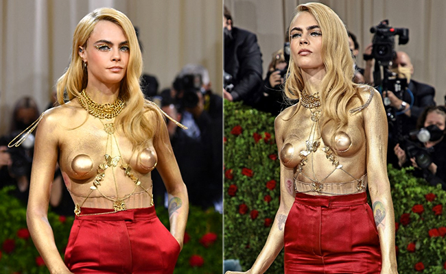 The MET Gala 2022 theme was "In America: An Anthology Of Fashion" with a dress code of "Gilded Glamour" which represents opulent touches of the Gilded age. While the MET red carpet saw plenty of feathers, corsets and ruffles, some celebrities spared nothing and no one to take the dress code to its maximum. Cara Delevingne was one of them. The supermodel first walked down the red carpet wearing a red cropped jacket along with tailored red trousers. She paired it with red platform pumps and carried a decorative stick in her hand. But in a matter of time, she shed her coat and showcased the extend of the Gilded Glamour theme with the second part of her look.