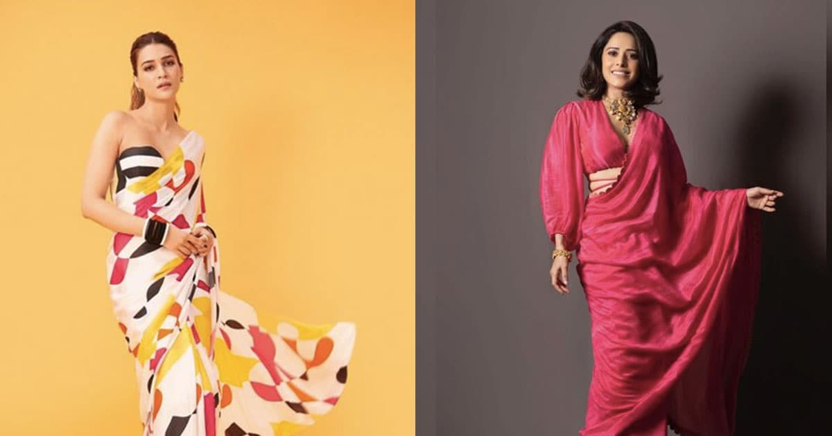 If subtle is not your thing, you can opt for vibrant particoloured printed outfits. Showing you how is Kriti Sanon donning a gorgeous white drape saree with abstract designs that make her look like a walking art canvas. She paired it with a strapless blouse and topped off the look with black bangles and a sleek ponytail.