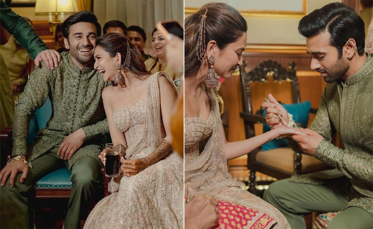 We are already considering 2024 a lucky year to celebrate all things love. It is just March and we have already witnessed multiple celebrity weddings. From Ira Khan to Rakul Preet Singh and now Kriti Kharbanda, it is officially the year of celebrity weddings. Kriti Kharbanda recently got married to her longtime beau Pulkit Samrat in an intimate yet dreamy affair. While we were still gushing over their wedding pictures, the couple decided to drop an array of more candid shots to treat us. They shared beautiful shots from the mehendi ceremony, and we couldn't help but notice the high-fashion vibe. We never thought champagne and green hues could create such a magical setting. Kriti Kharbanda turned to a beautiful shimmery outfit by Ritu Kumar that came with subtle yet intricate floral details in pastel hues. The strapless style perfectly complemented the corset pattern and the flared skirt perfectly put it all together. She ditched the necklace to create an impact with her statement jhumkas and maang tikka. While Kriti dazzled in shimmer, Pulkit opted for a monochrome look in an olive green kurta set by Faraz Manan. The bandhgala embroidered kurta paired with straight-fit pants was a fitting choice for the ceremony. Well, their style and smiles were perfect for their new beginnings.