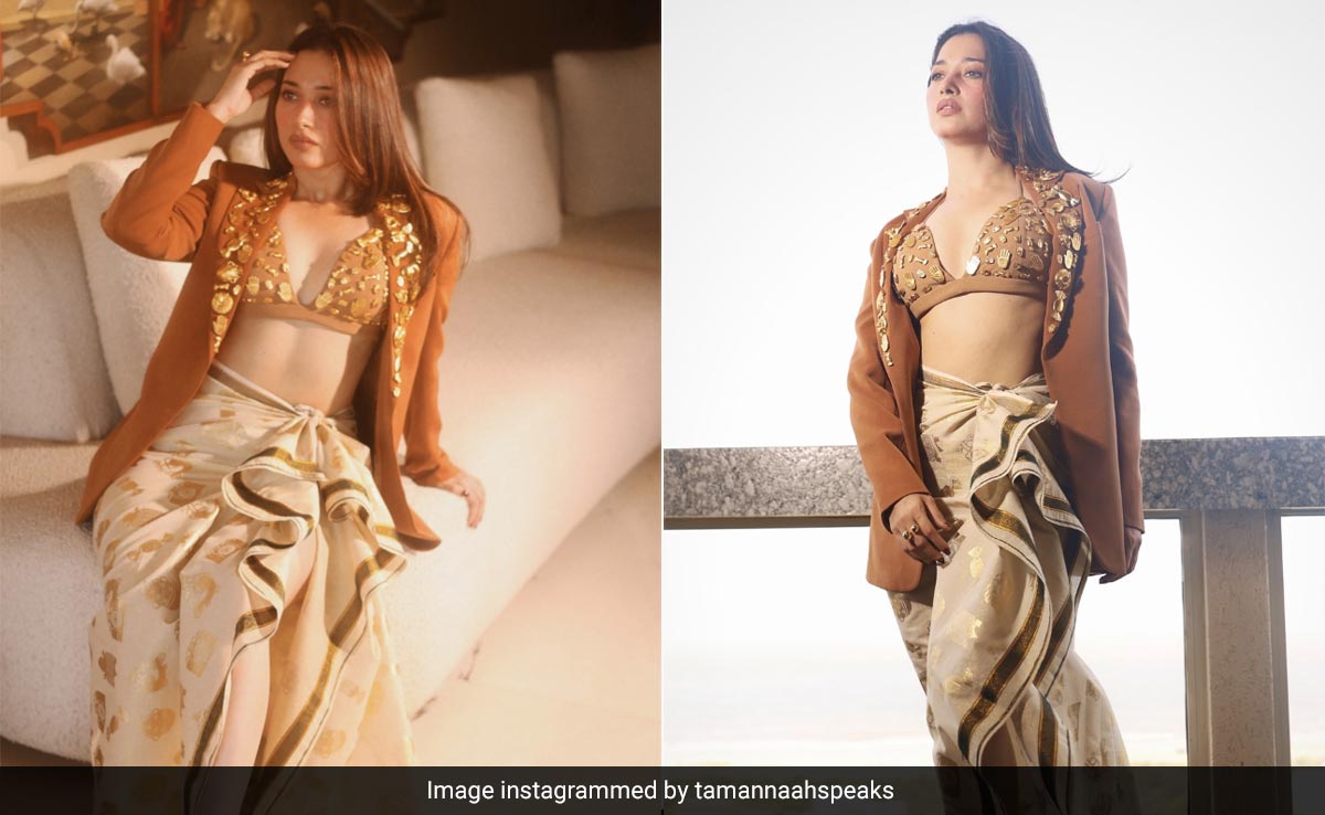 Tamannaah Bhatia's fashion choices shed light on her expertise in the sartorial field. Taking an unconventional detour this time, the actress weaved bohemian and ethnic elements together, for the promotions of Aranmanai 4. Helping her achieve the feat was the designer label House Of Masaba. Tamannaah wore a deep-scooped blouse in a caramel shade and layered it with a matching colour-coded lapel-collared blazer. The jacket came with breast pockets too. Iconic house motifs in gold, reimagined as wearable art were stitched to the collars and the blouse. A signature House Of Masaba input indeed. Instead of trousers, Tamannaah paired the chic combo with a knotted veshti-like skirt with a side slit. Bronze prints and borders were the x-factor. For makeup, the actress resorted to the nude colour palette and rounded off her look with long open hair.