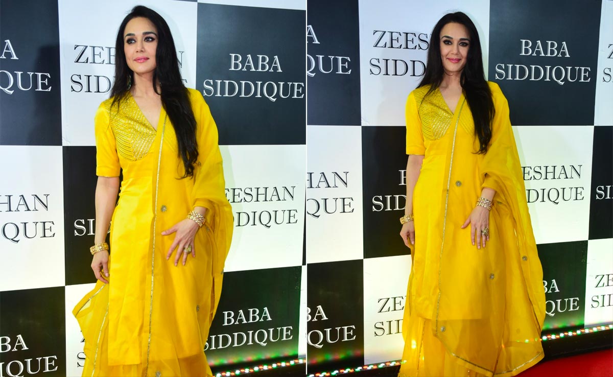 Salwar suit sets can never go out of fashion. Right from stunning shararas to patialas, the diversity in salwar sets, will often leave you spoilt for choice. Someone who just made heads turn in this evergreen ethnic wonder is Preity Zinta. She wore a beautiful yellow number for Baba Siddique's Iftar party. Her outfit consisted of a long yellow kurta featuring silver work at the torso, and a matching lehenga showcasing wide borders. A bright yellow dupatta completed her traditional avatar. Preity picked earrings, bangles and statement rings from the accessory department. For makeup, she went for contoured cheeks, smokey eyes and nude lipstick. Her silky tresses were left open.