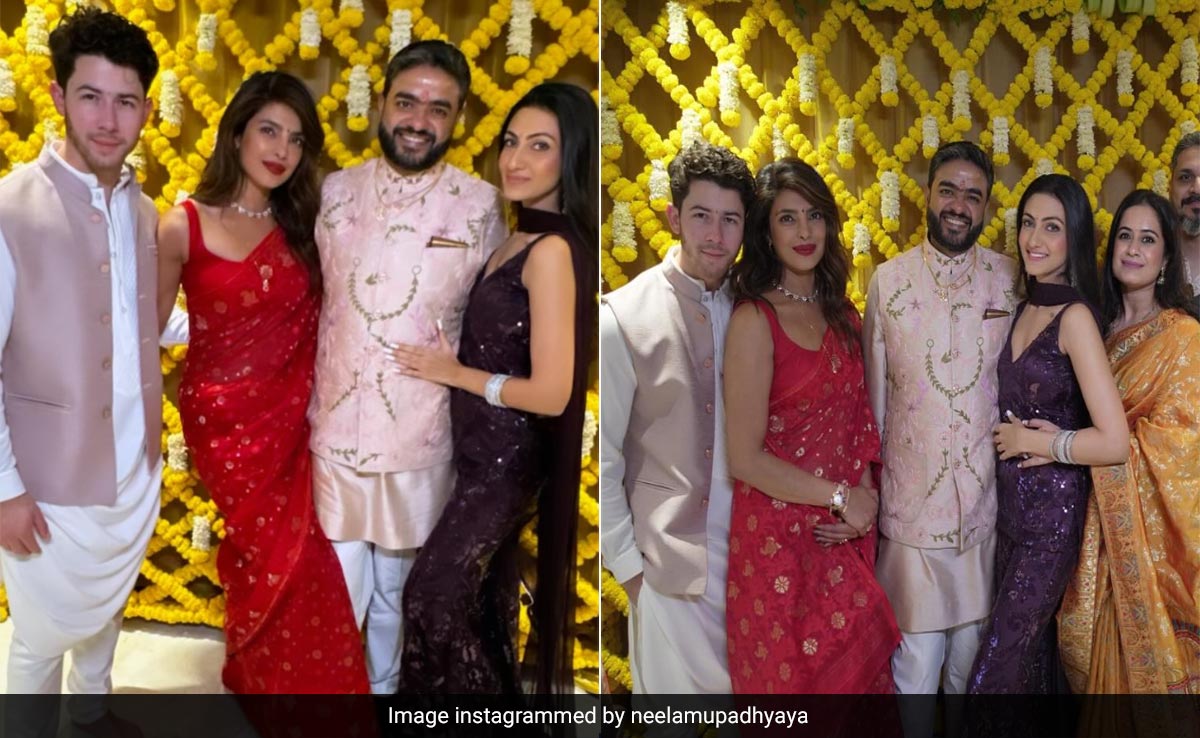 Priyanka Chopra always delivers a wide sphere of fashion for us to bookmark. Her recent trip to India gave us insight into her ever-so-fabulous sartorial sensibilities as she continued to serve looks, one after the other. Her penchant for turning every look into a sartorial masterclass is a given. Priyanka's it girl dressing continued to reign supreme when she dressed up for the Roka ceremony of her brother Siddharth Chopra. The actress trusted a beautiful ethnic staple to be the most stylish guest. In a stunning red saree, Priyanka took her festive fashion to a whole new level. The beautiful, subtle prints on the saree matched the traditional aesthetic. Her makeup consisted of a bold red lip and highlighted cheeks that sealed the beauty deal. Nick complemented Priyanka in an ivory kurta set that was paired with a rose gold half jacket. The couple rocked the traditional dress code like never before in their minimally chic and elegant looks.