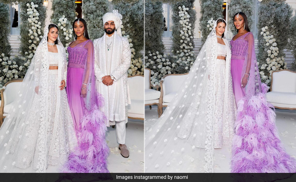 Naomi Campbell effortlessly transitions to whatever the style memo of the occasion is. Her unparalleled versatility is beautifully reflected in her wardrobe selections. Recently, the renowned supermodel captivated attention at the wedding celebrations of billionaire Umar Kamani and Nada Adelle by soaking in the Indian festive fervour. She turned to designer Manish Malhotra to ace Indian style. She exuded elegance in a bespoke bright lavender beaded saree gown that was perfect for the celebration. The structured corset bodice was adorned with intricate floral embroidery and the sweetheart neckline perfectly complemented the pattern. It was all put together with a figure-grazing skirt that descended into crisp pleats. The sheer drape with feather details was the highlight of the look. Dainty diamonds perfectly matched her desi wedding guest attire and her dewy glam was right on point.