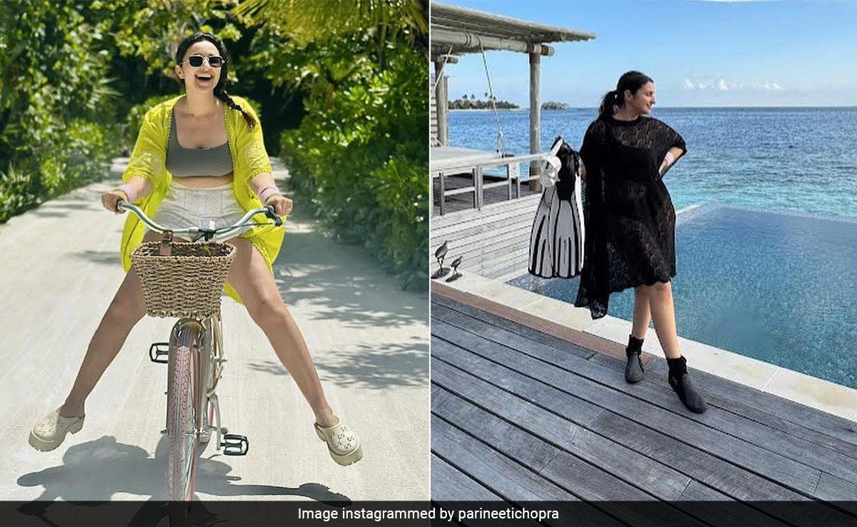 Parineeti Chopra tops our list when it comes to seeking vacation inspiration. The actress never disappoints us. Parineeti is having an amazing year and we can't stress that enough. After getting married in September, Parineeti jetted off to the Maldives ahead of her birthday last month. Well, not her honeymoon but a cool girls trip. The actress has yet again teased us with a series of throwback pictures and they surely need your immediate attention. She went on this vacation with her in-laws and mother. In the opening frame, Parineeti can be seen riding a bicycle on a sandy road. The next slide has to be the most stylish picture on the internet today. It shows Parineeti soaking in some Vitamin D with her mother Reena Chopra, sister-in-law Gauri Chadha, mother-in-law Alka Chadha and friends.